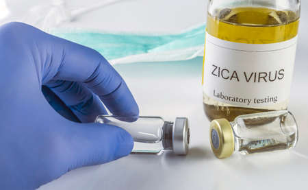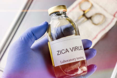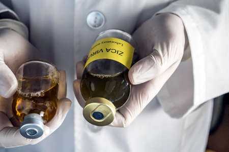 Doctor holds a sample vial of Zika virus in a hospital. Conceptual image