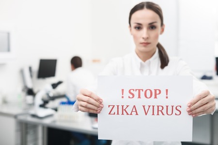 Stop zika virus. Professional young doctor is standing and showing placard. Woman is looking at camera seriously. Man is sitting at table on background