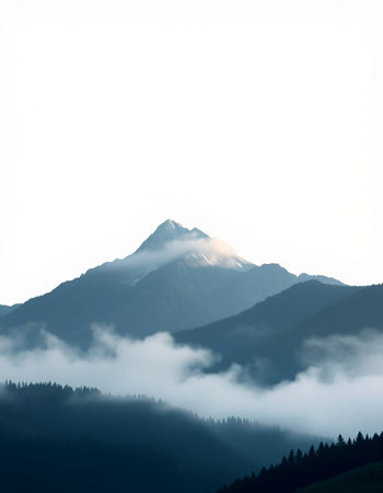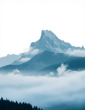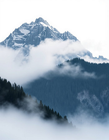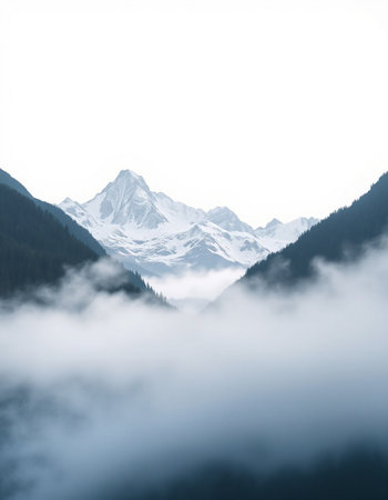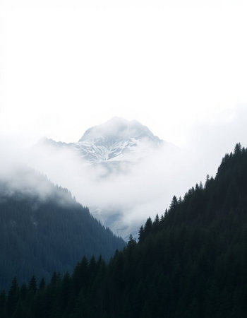 A stunning view of a snow-capped mountain rising majestically above a misty forest, capturing the serene beauty of nature at dawn. The peaceful landscape invites exploration and adventure.