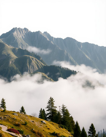 A breathtaking view of a misty mountain landscape featuring towering evergreen trees and a soft blanket of fog, evoking serenity and tranquility in nature's beauty.