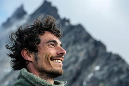 Man with a joyful expression, standing on a snowy mountain at sunset, bathed in warm golden light