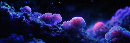 Glowing bacteria create a stunning display of colors when illuminated by ultraviolet light in a dim, underwater setting.
