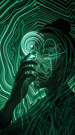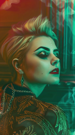 Captivating and Edgy Female Portrait with Intense Color Palette and Dramatic Lighting The image showcases a stylish and bold woman with a strong confident expression and a striking visual impact