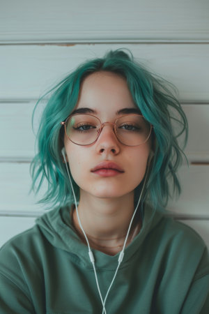 Millennial enigmatic pretty girl with unusual dyed hairstyle near glowing neon wall at night. Blue hair, golden sequins as freckles,nose piercing. Mysterious hipster teenager in glasses