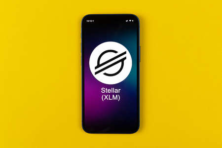 Stellar XLM symbol. Trade with cryptocurrency, digital and virtual money, banking with mobile phone concept. Business workspace, table top view