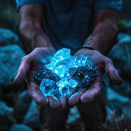 A man holds a piece of glowing blue ore in his hands. Blue toned