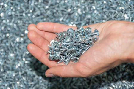 Hand holding silver metal screws on a background of various gray screws. The choice of screws in the store.