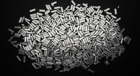 A high-angle shot showcases a dense pile of silver-colored metal pellets, uniformly shaped, scattered across a stark black surface, creating a striking contrast.