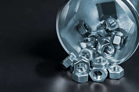 Small hex nuts spilled on heap in big socket for ratchet wrench with reflection on black background. Close-up of stainless steel hexagonal fasteners with threaded hole poured on pile in metal spanner.