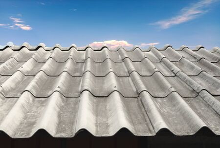 Close-up. Old slate roofing sheets. Asbestos-cement surfaces made of corrugated slate sheets. Gray texture of wavy weathered abandoned asbestos roof background. Roofing materials are hazardous to health.