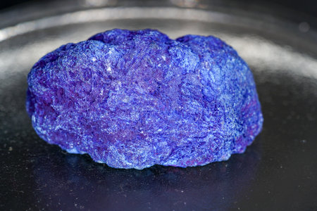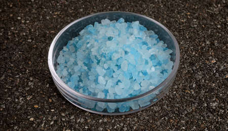 Blue salt minerals in a Petri dish on a ruberoid grain surface. Black textured background. Blue salty crystals in chemical flat glassware. Natural sea salt granules for cooking and bathing.
