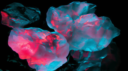 Vivid abstract overlay texture with neon blue and pink floral patterns on black background