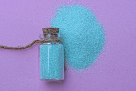 one small decorative glass bottle with blue sand lies in a pile on a purple table