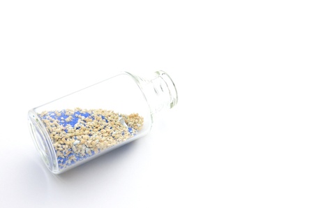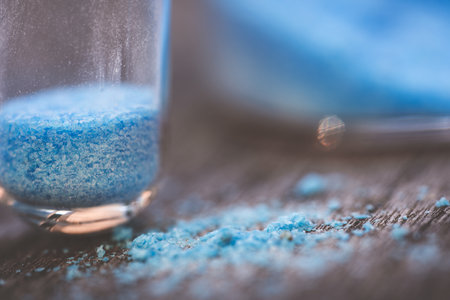 blue copper sulfate granules in glass floors - insulated close-up on wood background