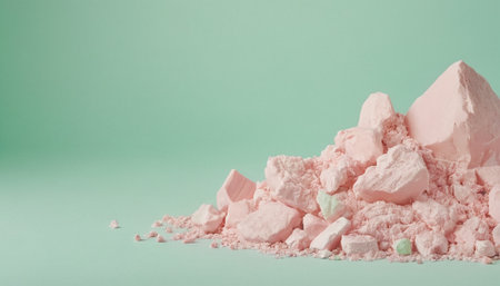 Pile of pink crushed stones on pastel green background with copy space