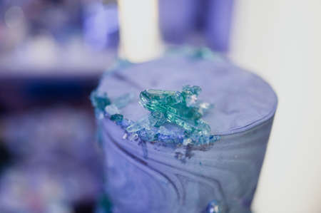 Glittering blue crystal jar on icy surface