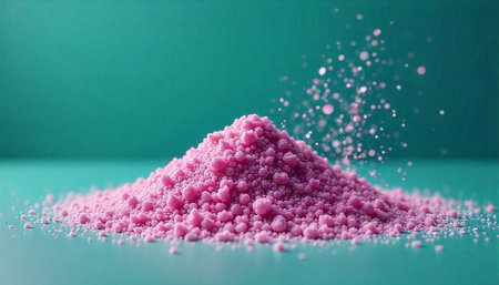 Pink powder mound with floating particles on teal background