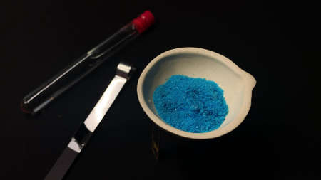 Blue vitriol stock images. Laboratory accessories images. Brown glass containers with Copper ii sulfate. Brown chemical glass, bowl and laboratory spoon. Laboratory equipment