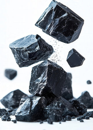 Pieces of coal falling into the air on a white background.