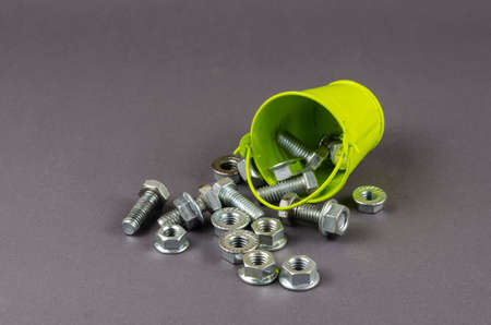 Bolts, nuts and a small green bucket on a gray background. Shiny metal hardware spilled from the fallen bucket. Close-up, selective focus.