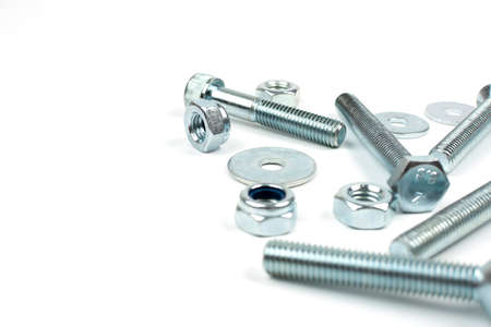 Metal nuts isolated on a white background. Chrome nuts isolated. Steel nuts isolated. Tools for the job.