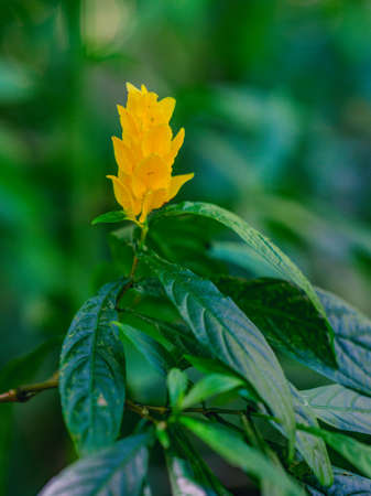 The photo of the flower was taken in the jungle of the Caribbean island. The lighting in the photo is natural, the background is blurred, in the center of the composition is a yelllow flower bud.