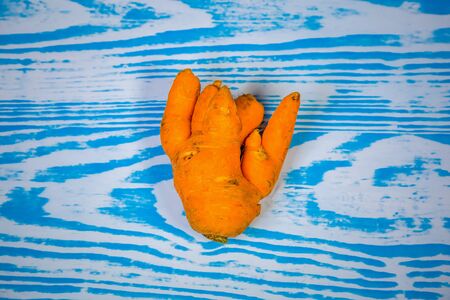 Farm fresh ugly carrots bent and twisted. Funny carrot in the shape of human fingers. Funny carrot series.