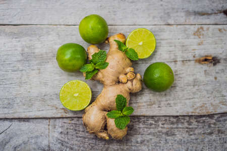 Fresh sicilian lemon slice with ginger on a white wooden background.