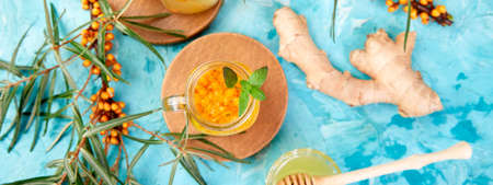 Colorful hot sea buckthorn tea with ginger and honey and sea buckthorn berries on blue table. Top view. Vitaminic healthy. Immune system booster food, antiviral beverage.