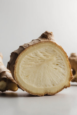 AI Generated. Cut ginger root with fibrous interior closeup