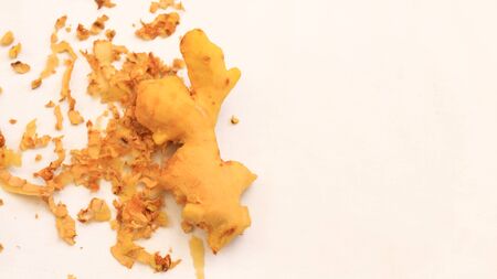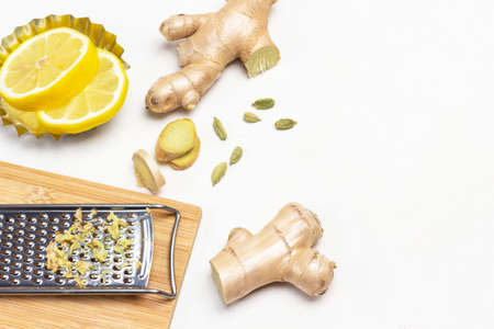 Grater with grated ginger. Ginger root and lemon on table. Copy space. Flat lay. White background.
