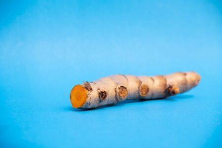 turmeric fresh on blue background. concept healthy spice diet.