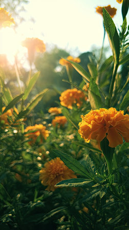 The Marigold in spring, fresh green leaves, soft sunlight filtering, vibrant atmosphere full of vitality, natural textures, serene mood P.