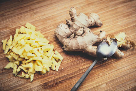 Ginger peeled with a spoon, chopped bites beside, wooden ground