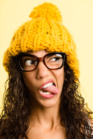 Shot of an attractive young woman standing alone in the studio and pulling funny faces while wearing a beanie.