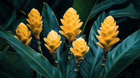 Bright yellow ginger flowers blooming against a backdrop of deep green leaves, showcasing their unique shapes.