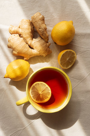 Flat Lay with Lemon Tea, Ginger and Honey on Light Table under Sun Light