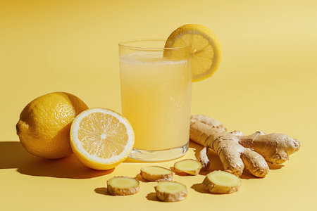 Fresh lemon ginger drink with sliced ginger and lemons on a vibrant yellow background, evoking a refreshing and healthy beverage concept