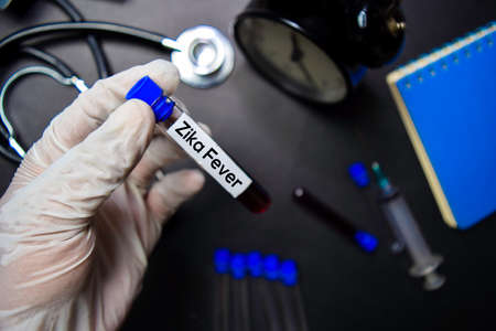 Zika Fever text with blood sample. Top view isolated on black background. Healthcare/Medical concept