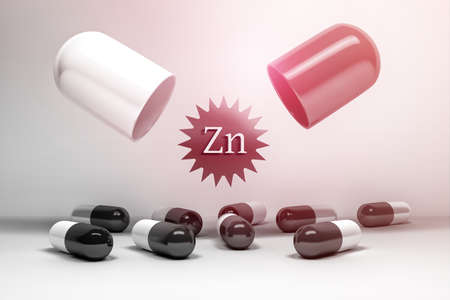 Mineral food zinc supplements. Large medical capsule with Zinc letters and many small pills. 3d illustration.