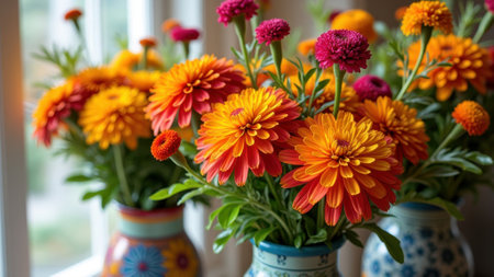 Colorful flower arrangements in decorative vases by window. That the image is generated using AI.
