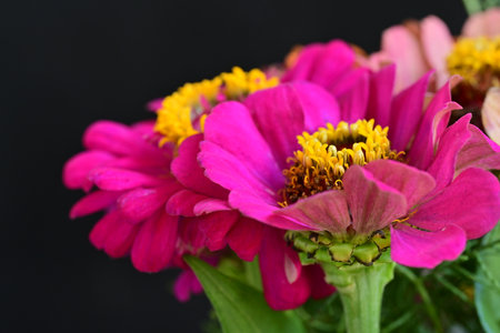 Close up of Zinnia flowers in bloom with copy space on green background.