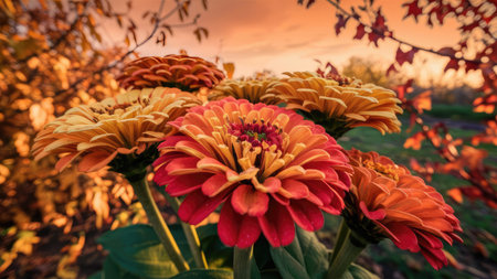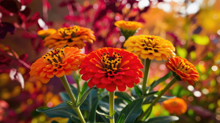 Vibrant Zinnia Blooms in Sunlight, Background for Greeting Card Design Featuring 2026 Floral Trend.