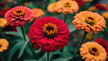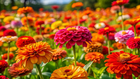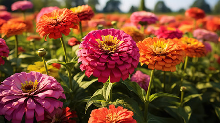 A variety of colorful zinnias flourishing in a sunlit garden. Generate AI