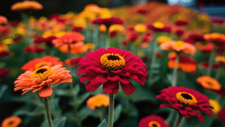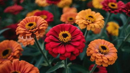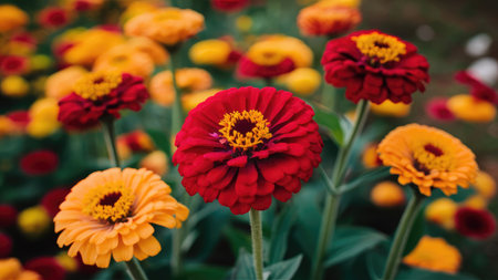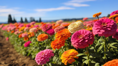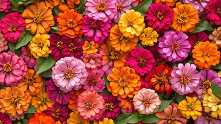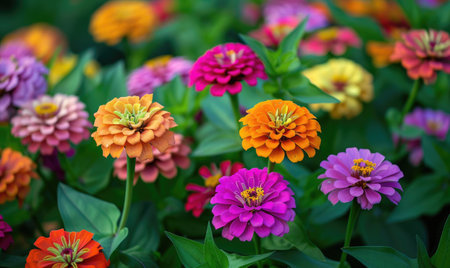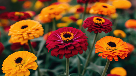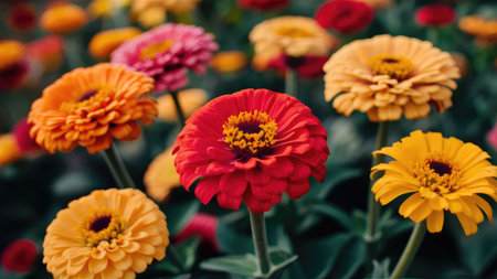 A bed of colorful zinnias in full bloom, creating a lively and festive floral background