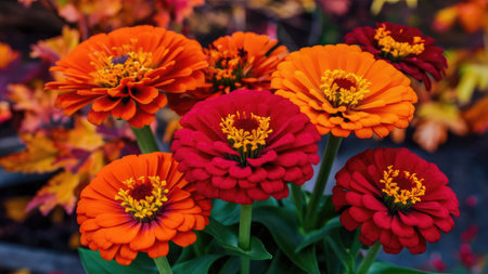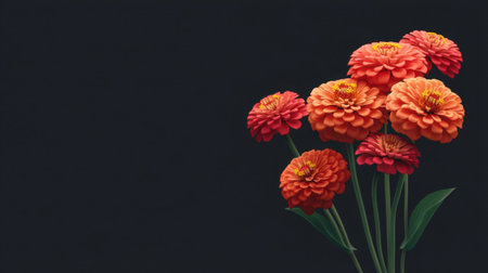 A stunning arrangement of vibrant zinnia flowers in shades of orange and red stands out against a dark background, perfect for nature-themed designs or floral decoration.