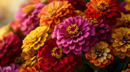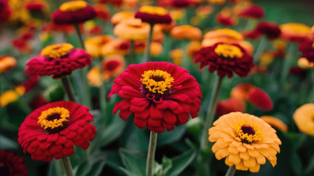 Close-up of colorful Zinnia elegans flowers creating a vibrant and cheerful atmosphere