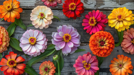 A variety of zinnias arranged in a circular pattern on a rustic wooden floor, their colors creating a lively visual.
