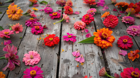 Vibrant zinnias scattered across a weathered wooden floor, their colors creating a lively display.