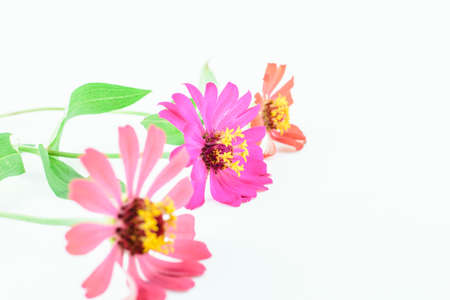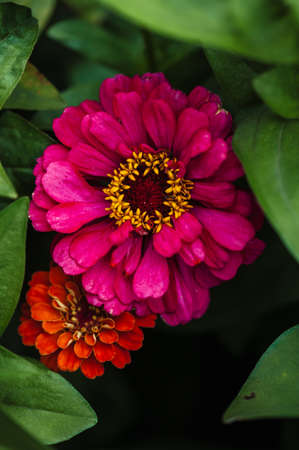 Pink and orange flowers of zinnia in green leaves. Frame. Art.